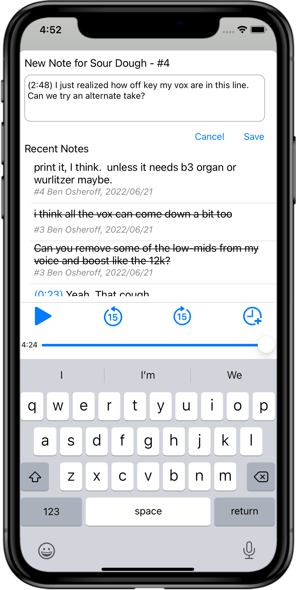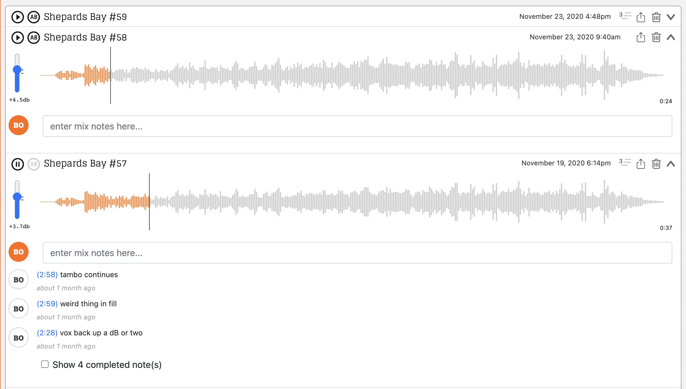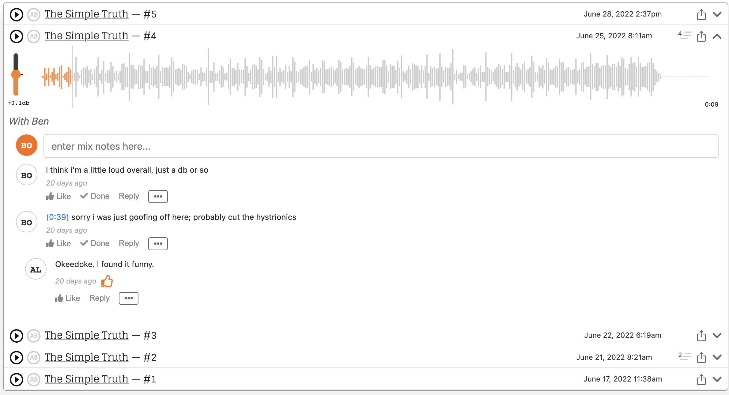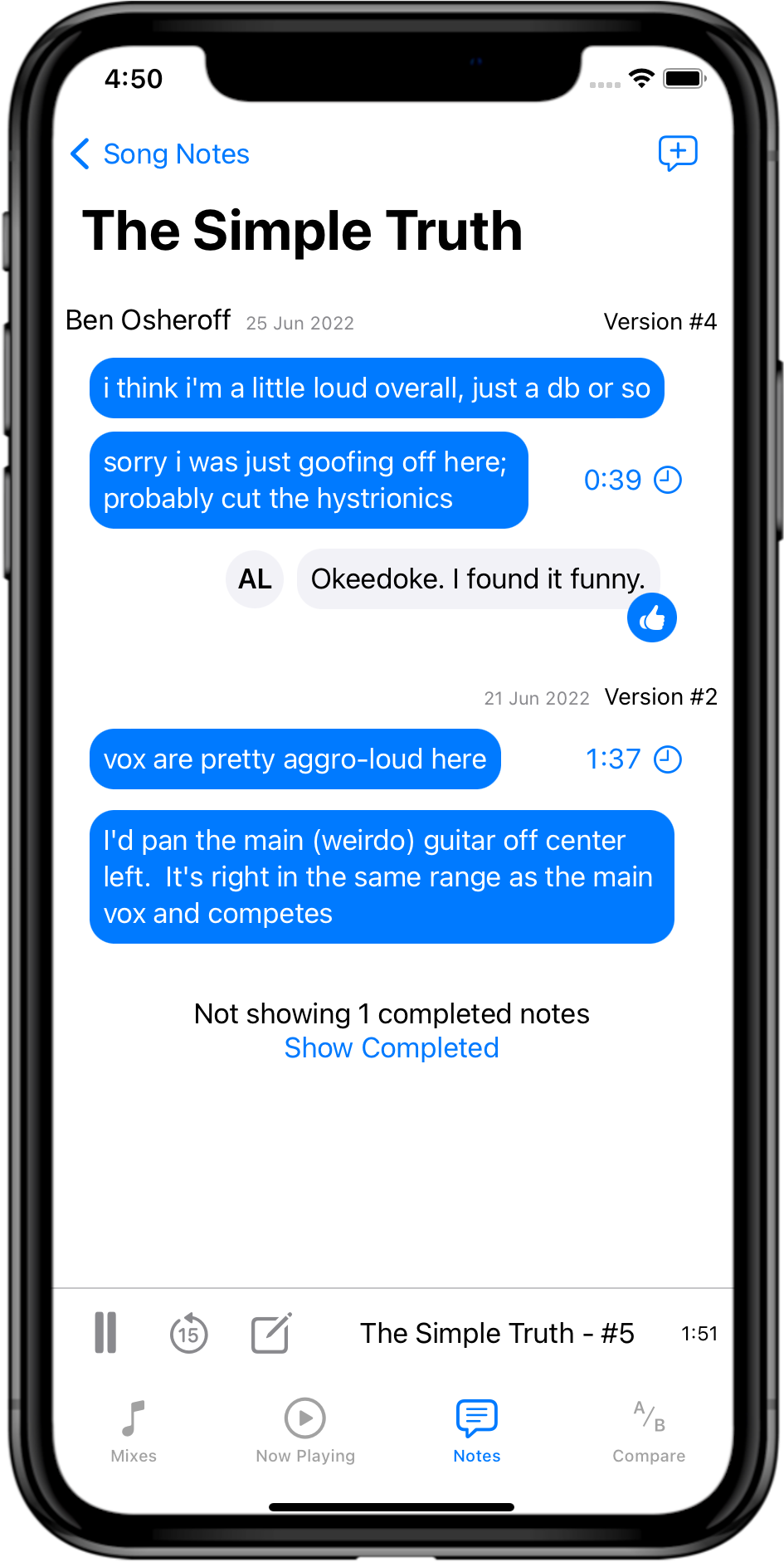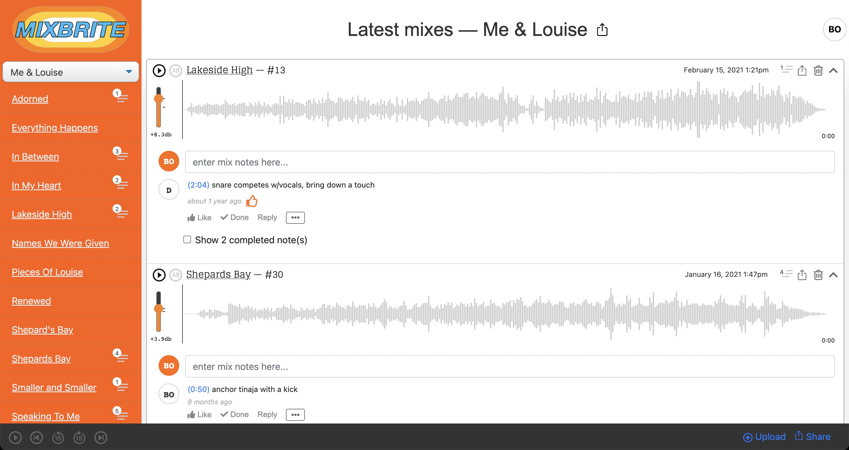 Mixbrite's notes are a great way to collect feedback from collaborators, as well as a time-indexed TODO list for your music.